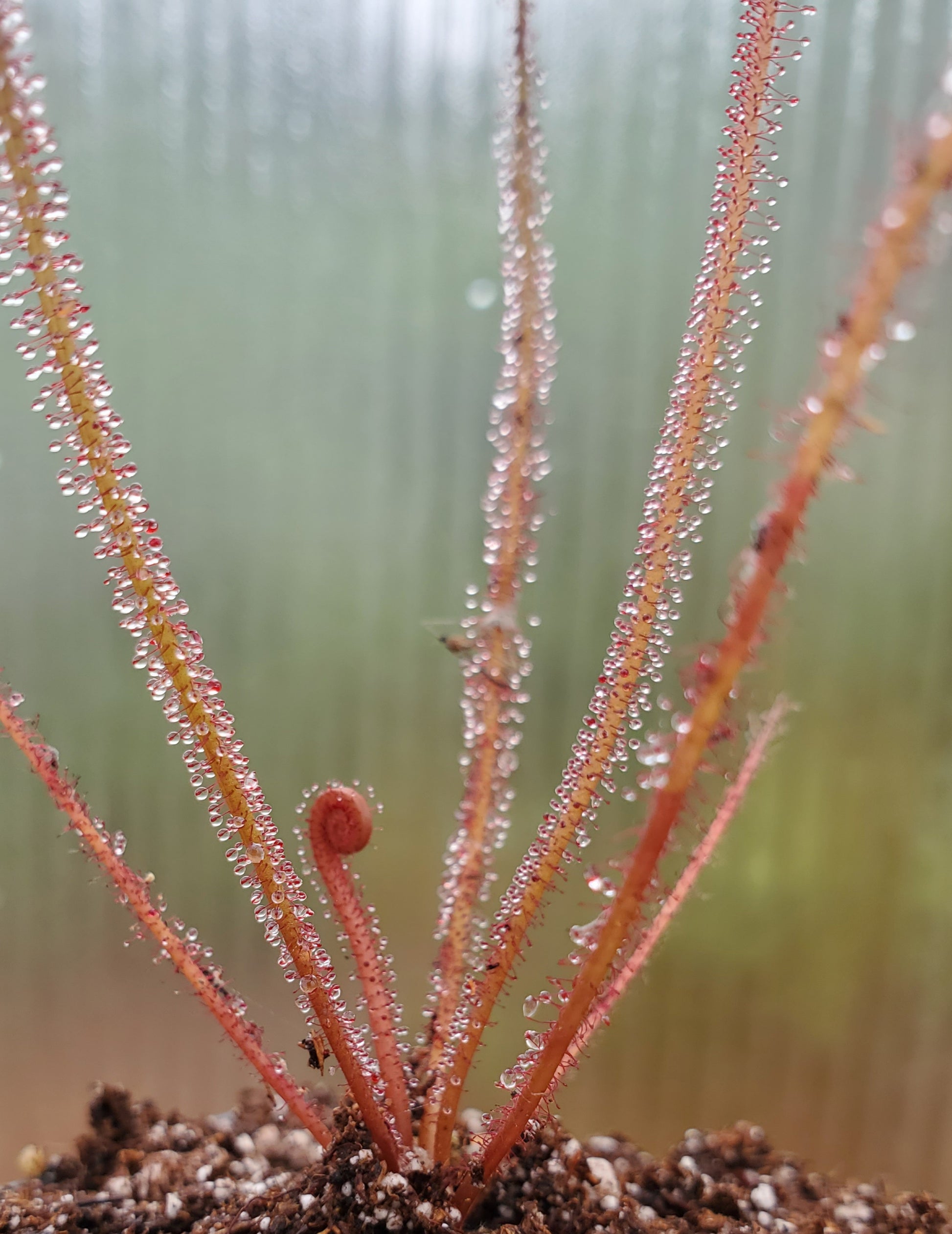 Drosera Care: Sundews do best in partial shade to full sun. They are well suited for growing on window ledges or outdoors during warm months. They must be watered with non-chlorinated water preferably with a low TDS (between 0 and 25ppm). You can use rain water, RO or distilled. Allow to dry slightly but not completely in between waterings. When watering, place plants in a tray and pour water in tray about 1/2” (referred to as the tray method). Avoid watering the crown of the plant. Temperature should be maintained between 60°F and 85°F. They are not too particular about humidity requirements. If your Drosera has little to no dew, increase light. They generally do well in open terrariums. *Filiformis and intermedia will die back during the winter to form a “winter bud”. In the spring it will ‘wake up’ and begin producing leaves again.