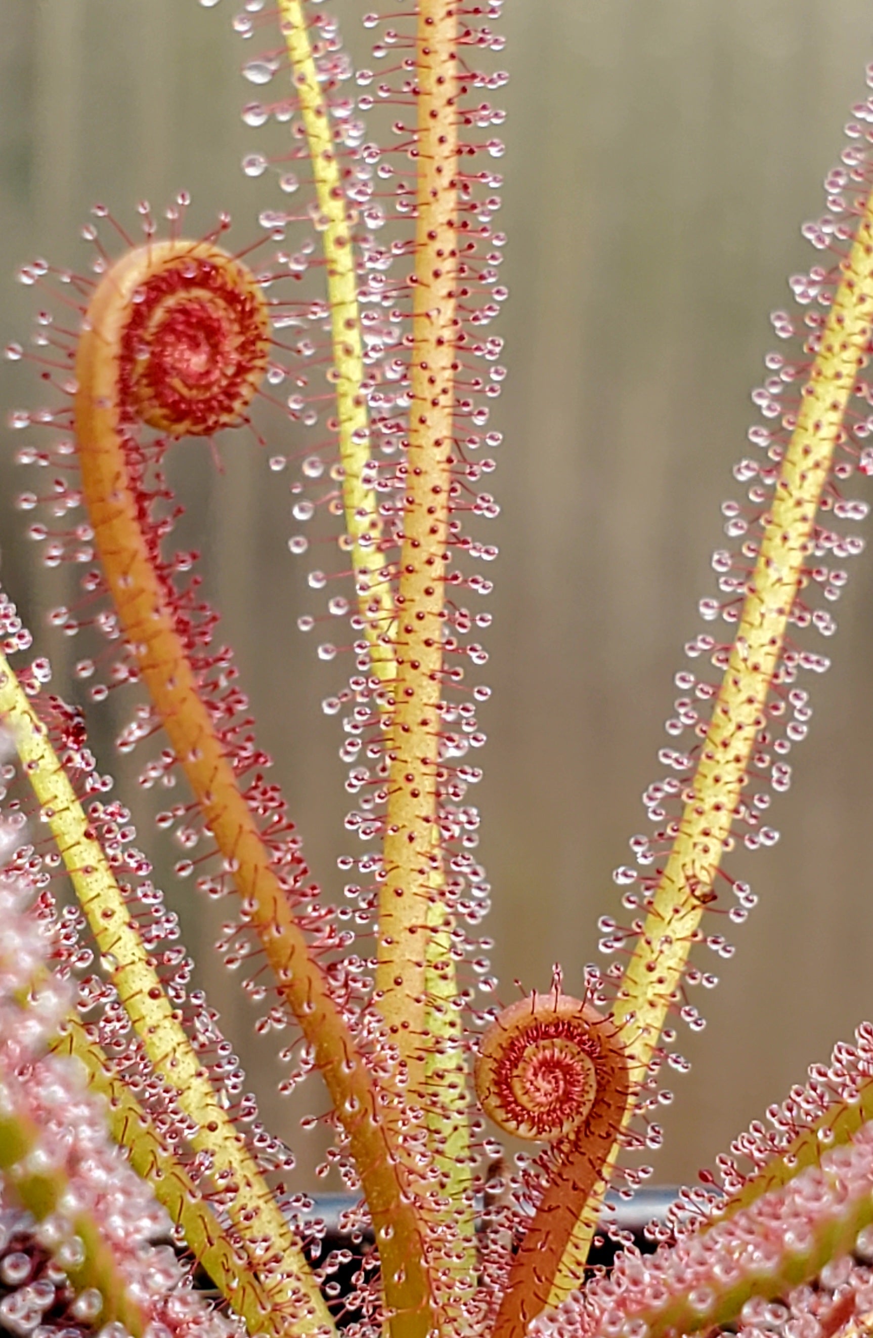 Drosera filiformis is a lovely sundew native to the eastern United States. They are cold hardy and can survive to zone 5. During the winter the leaves will die back and the plant will form a winter hibernacula. In full sun the leaves turn a deep red. The flowers are pink to purple and bloom in sequence on a stalk that grows tall.
