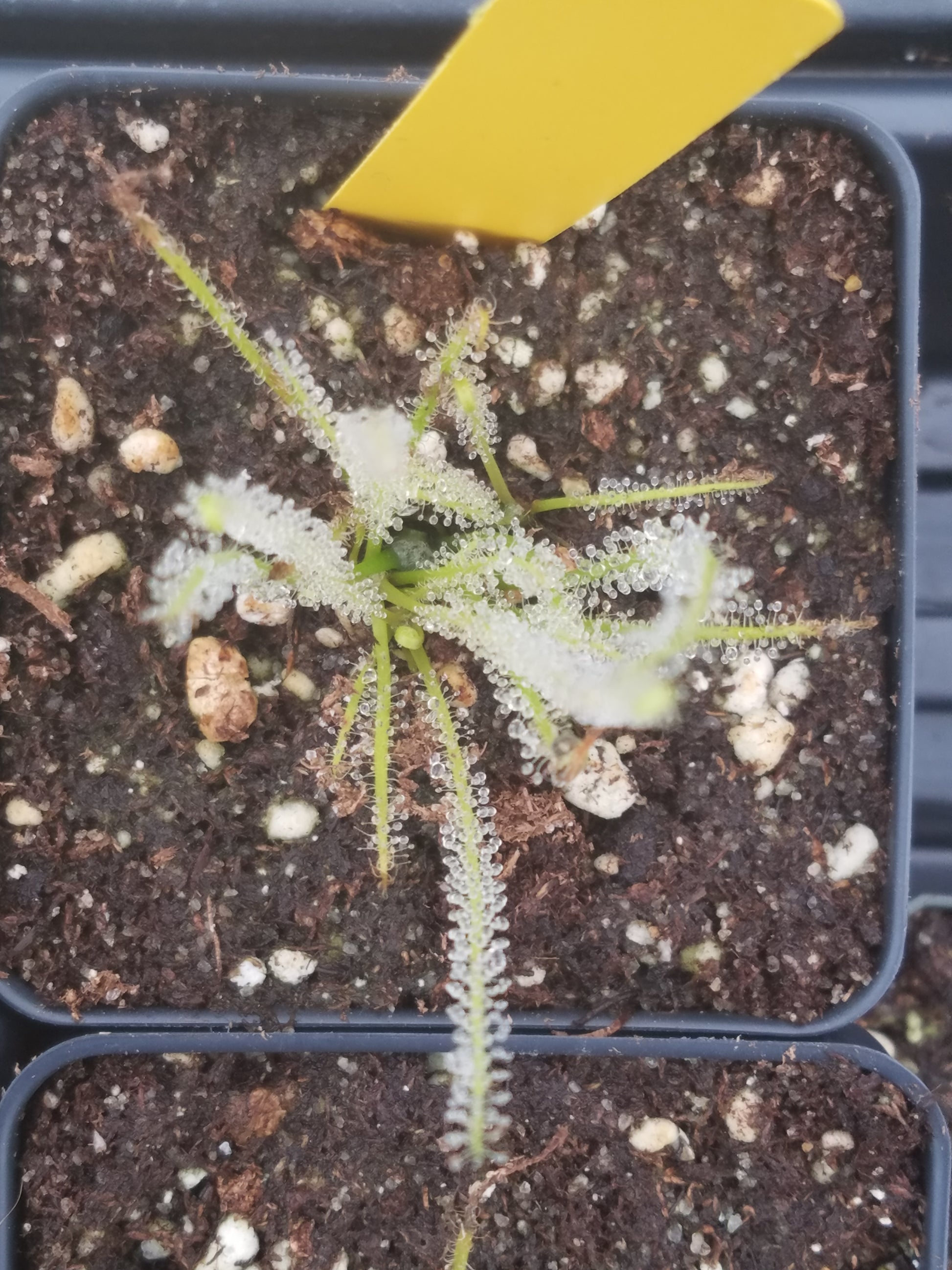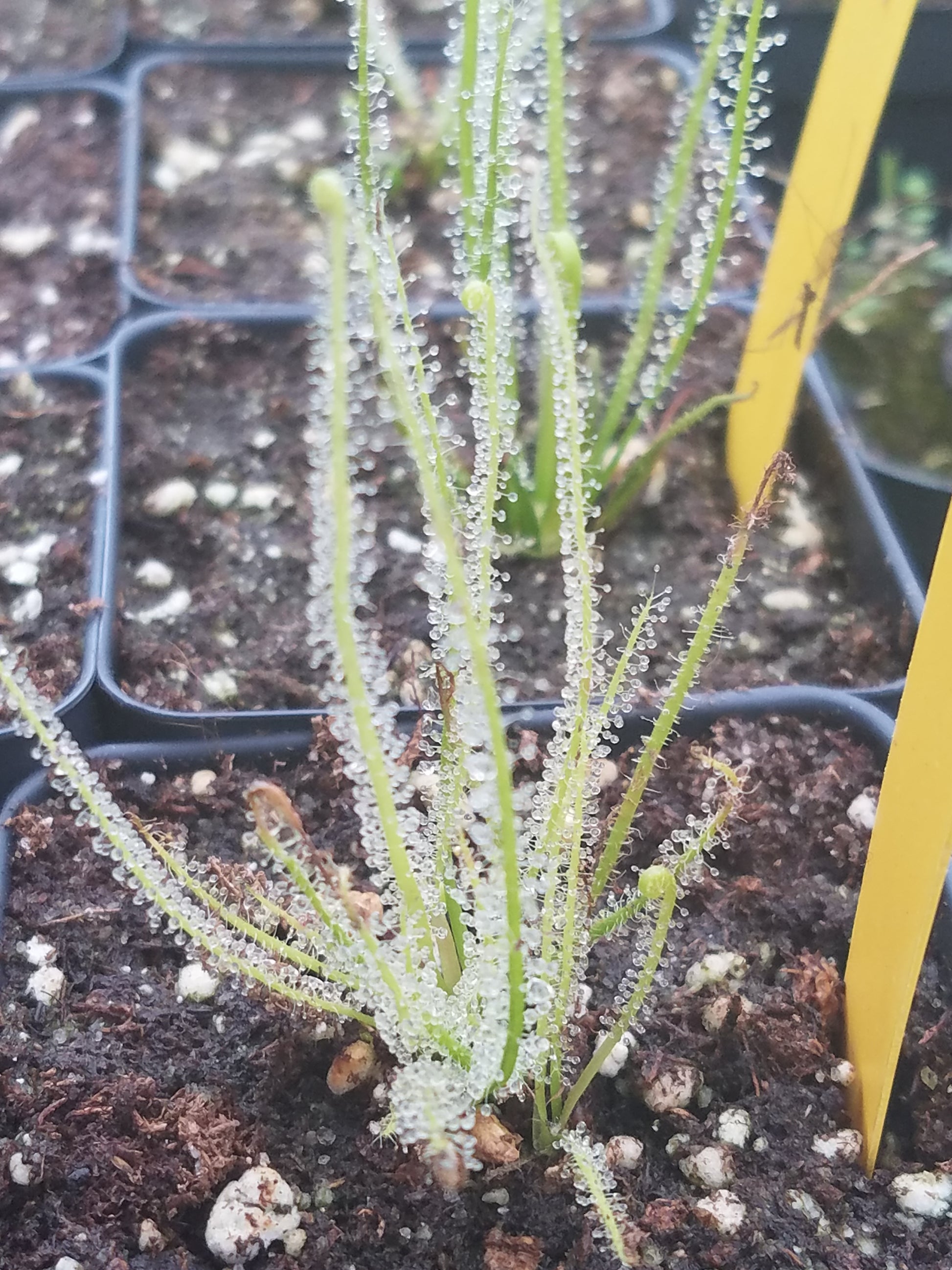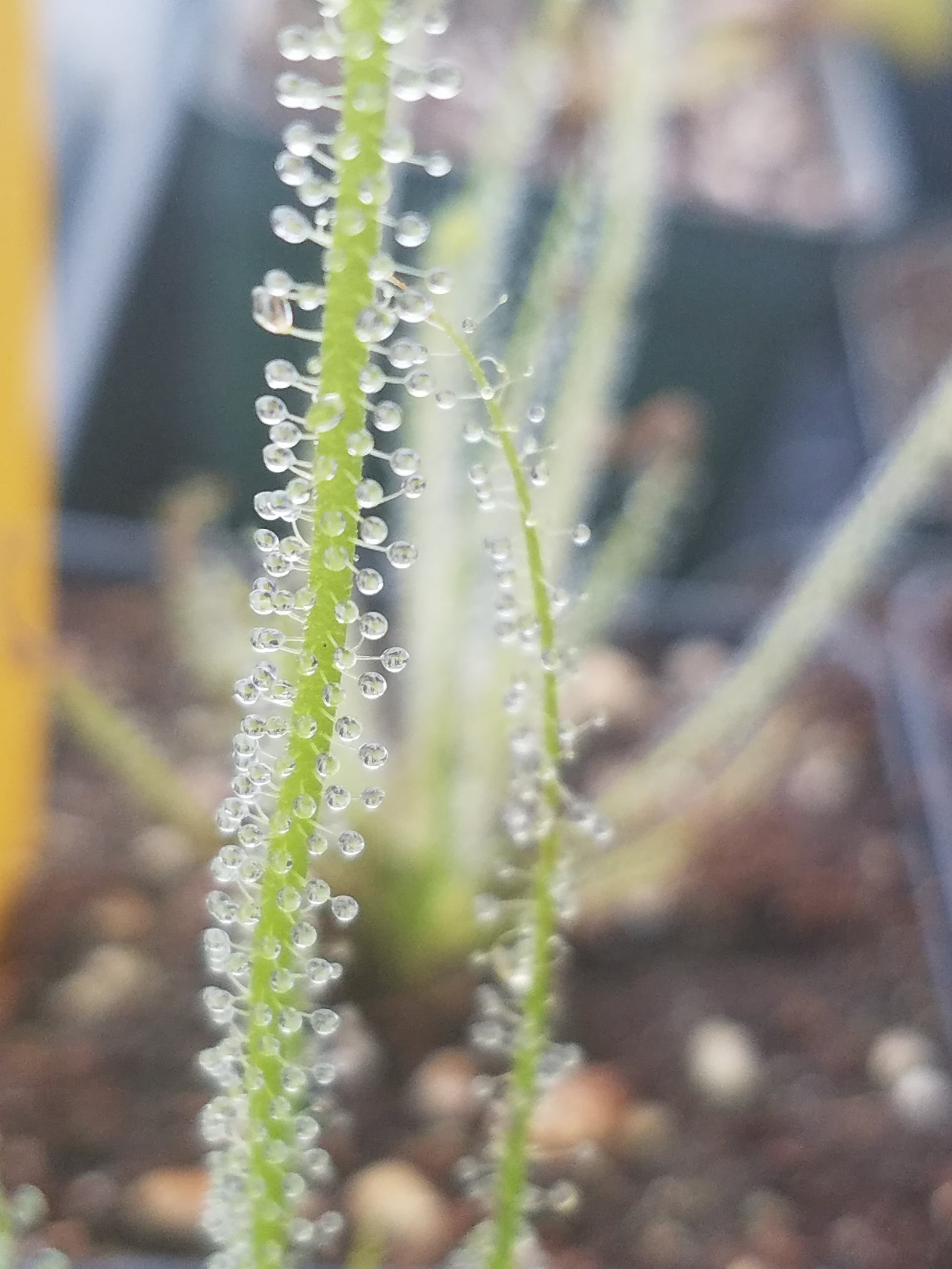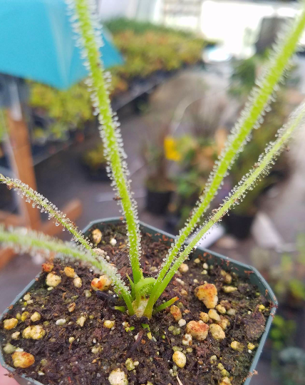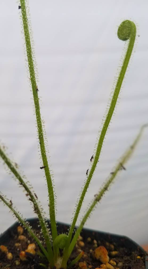This easy to care for sundew is named for their long and delicate looking leaves covered with clear dew. New leaves uncurl from the center until they become long and upright. The leaves can grow up to 20". These plants are master predators and can easily capture gnats, ants, and mosquitoes. They will go through a winter dormancy in which all the leaves die back and all that remains is the resting bud. In the spring, the plant will 'wake up' and produce carnivorous leaves again.