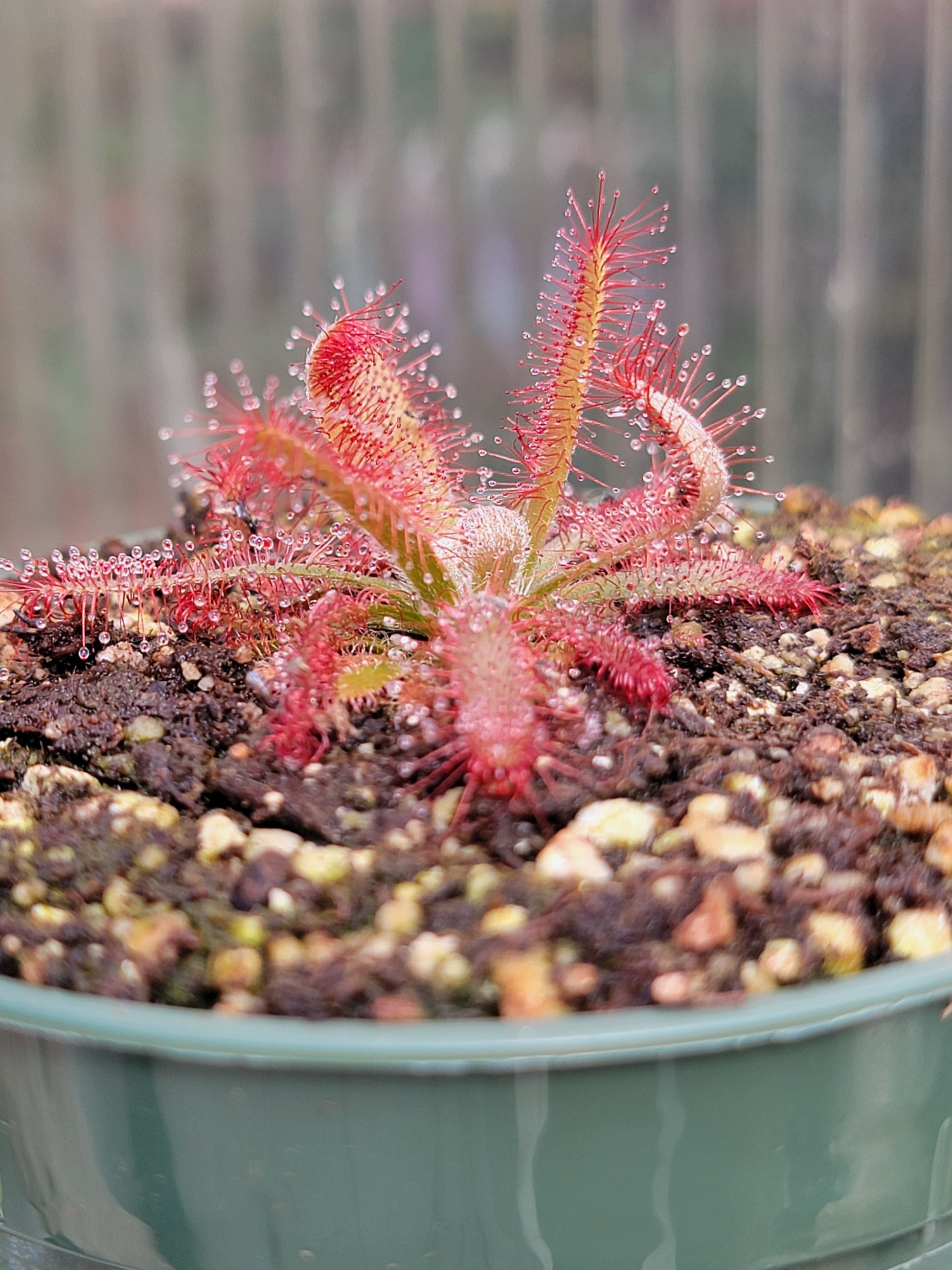 This South American sundew grows best in part shade to bright sunlight. They are well suited for growing on window ledges. They must be watered with non-chlorinated water preferably with a low TDS (between 0 and 25ppm). You can use rain water or distilled. Allow to dry slightly but not completely in between waterings. When watering, place plants in a tray and pour water in tray about 1/2” (referred to as the tray method). Avoid watering the crown of the plant.